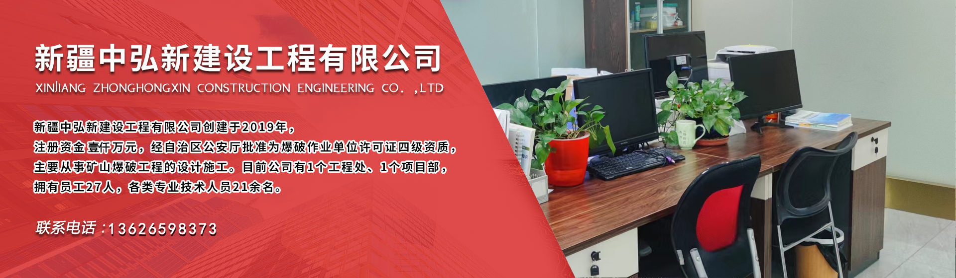 ZHONGHONGXIN CONSTRUCTION ENGINEERING   公 司 簡 介新疆中弘新建設(shè)工程有限公司創(chuàng)建于2019年,注冊資金壹仟萬元,經(jīng)自治區(qū)公安廳批準(zhǔn)為爆破作業(yè)單位許可證四級資質(zhì),主要從事礦山爆破工程的設(shè)計(jì)施工、礦上采掘施工業(yè)務(wù)。目前公司有1個(gè)工程處、2個(gè)項(xiàng)目部,分...